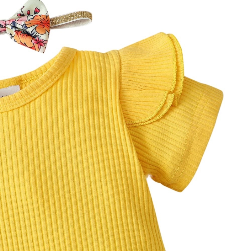 Hopscotch Girls Cotton Floral Print Onesie & Skirt Set with Headband in Yellow Color