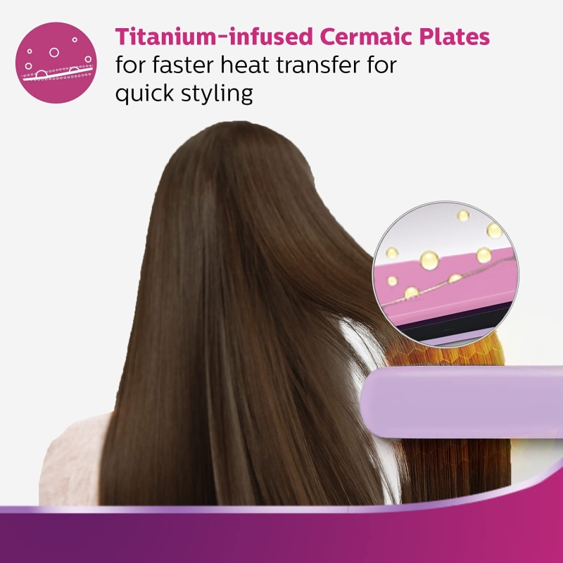 Quick and smooth styling with ceramic plates infused with titanium allows for fast heat transfer and smooth gliding through the hair